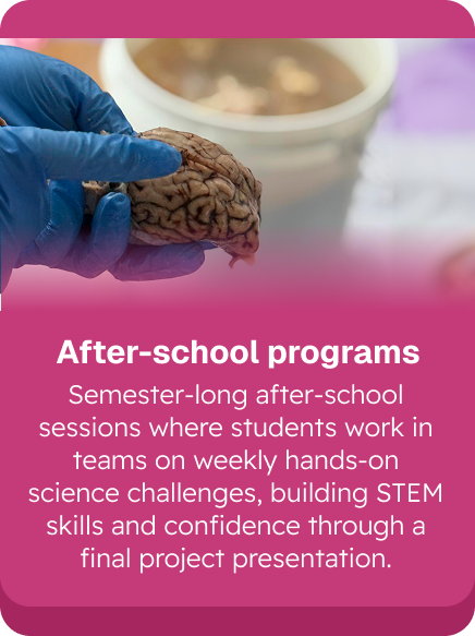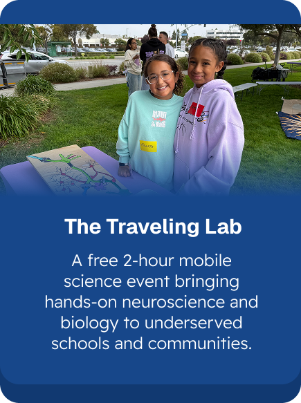 Ideal for: Schools, community centers, and outreach fairsThe Traveling Lab brings our mobile science experience straight to students — especially those who don’t often get the chance to explore science up close. Each visit blends interactive games, hands-on experiments, and stories from real neuroscience and biology research to make science feel exciting, approachable, and real.These events are always free for students, made possible through the support of local schools, community partners, and sponsors who share our goal of bringing high-quality science experiences to every child.